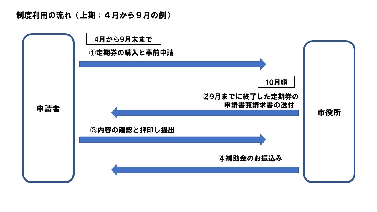※購入する度に事前申し込みをする必要があります。 - 10月頃と3月頃を目安に、市役所から事前申請した定期券についての申請書兼請求書を送付します。