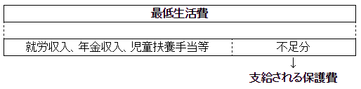 厚生労働大臣が定める基準で計算される最低生活費と収入を比較して、収入が最低生活費に満たない場合に、最低生活費から収入を差し引いた差額が保護費として支給されます。(支給される保護費は、地域や世帯の状況で異なります。)